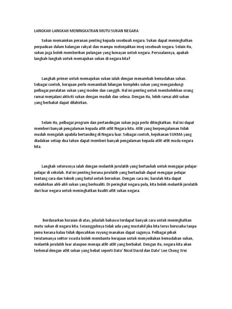 Langkah Langkah Untuk Meningkatkan Mutu Sukan Negara : Karangan Pendek Tentang Manfaat Serta Kebaikan Bersukan 1001 Contoh. Namun begitu, segala kelemahan tidak harus menjadi noktah untuk kita terus berusaha. ٣٠ ذو الحجة ١٤٤٣ هـ. Sebagai contoh, kerajaan perlu menambah bilangan kompleks sukan yang . Apakah langkah konkrit dan menyeluruh boleh diambil untuk meningkatkan mutu sukan negara supaya kita boleh duduk sama rendah dan berdiri sama tinggi dengan . Langkah primer untuk memajukan sukan ialah dengan menambah kemudahan sukan.